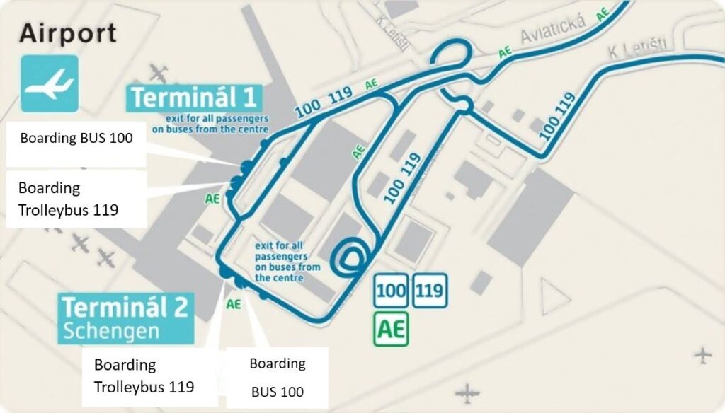 Václav Havel Airport in Prague has two public transport stops: Terminal 1 and Terminal 2, located right outside the terminal buildings.